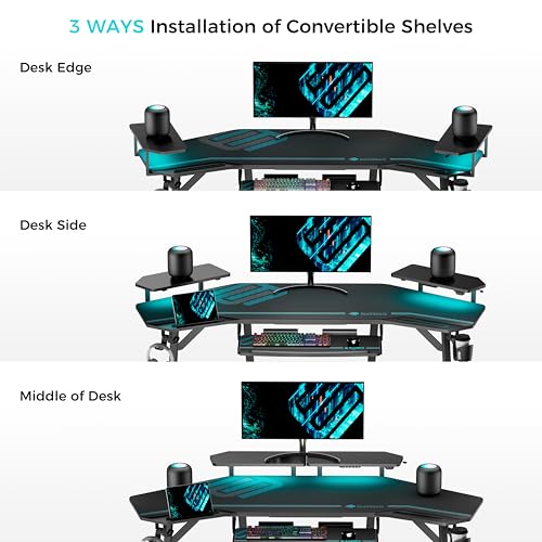 【Adjustable Display Shelf】In order to meet the needs of multiple computers used at the same time, the two display shelves of the computer desk can be freely installed in the middle, edge and both sides of the table. The shelf is equipped with adjustable LED lights, which can supplement the light source during the day and provide you with an immersive gaming atmosphere at night.