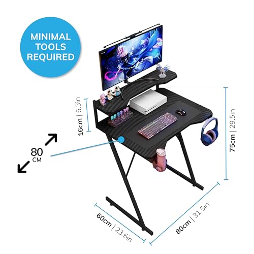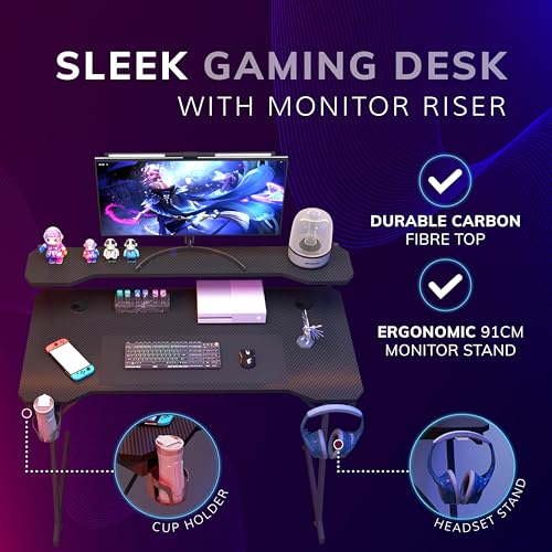 House Of Home Gaming Desk with Monitor Stand, 80cm Length, Carbon Fibre Top Ergonomic Computer Desk with Cup Holder
