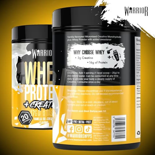 Warrior Whey Protein Powder + Creatine 500g – Sports Nutrition Shake for Muscle Growth, Performance, and Recovery – Enjoy Post Workout – Low Sugar – 20 Servings (Vanilla Ice Cream)