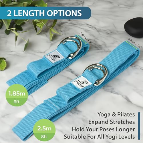 Beenax Yoga Strap Belt 1.85M, 2.5M, Extra Long Adjustable Strong Cotton 6ft 8ft with D-Ring Buckle, Exercise & Fitness Stretching for Yoga, Pilates, Dance, Gym Workouts and Physical Therapy