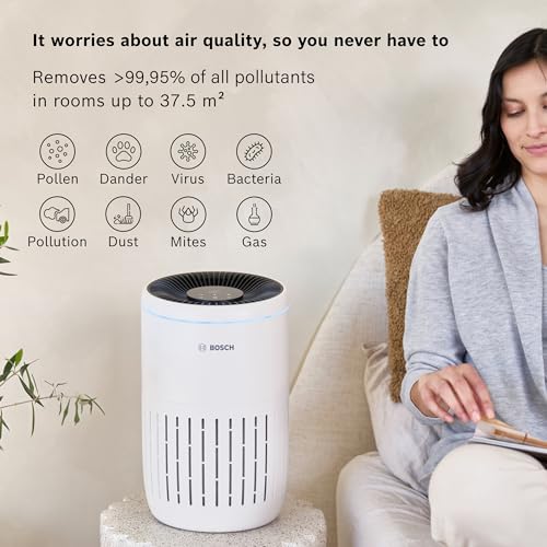 Bosch Air 2000 Air Purifier – For Areas up to 37.5 m² – Effectively Filters Over 99% of Pollutants – Includes Air Filter, Smart Sensor, Auto Mode, Sleep Mode (