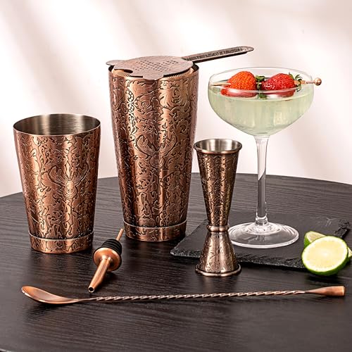 SKY FISH Boston Cocktail Shaker Set, 3D Embossed Design Bartender Set, 18-Piece Cocktial Making Kit, Stainless Steel Barware Tool Set, Antique Copper