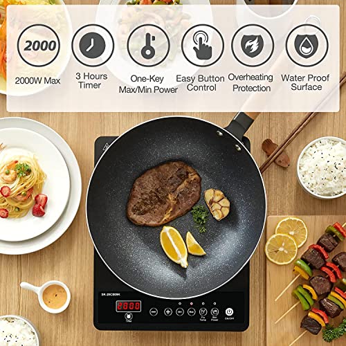 AMZCHEF Single Induction Hob, Portable Induction Hob, 10 Temperature Settings and Power levels from 300W to 2000W, Black Frosted Glass Panel,Sensitive Press Control, 3-hour Timer