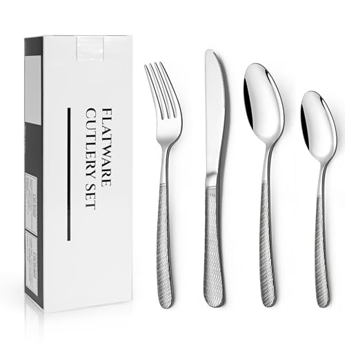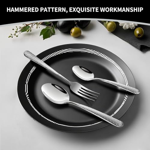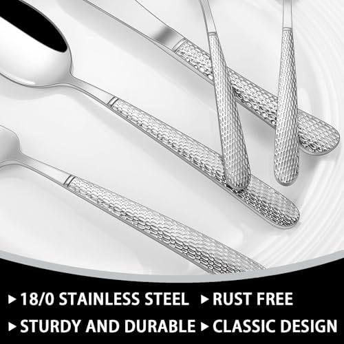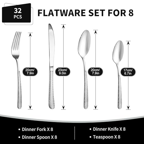 Estmoon Hammered Cutlery Set, 32 Piece Stainless Steel Flatware Set, Silverware Set with Spoon Knife and Fork Set, Service for 8, Dishwasher Safe, Mirror Polished