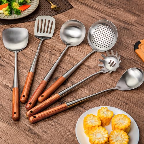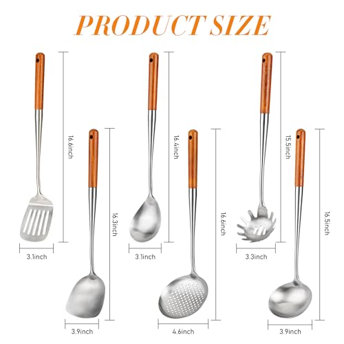 FJNATINH Wok Spatula, Ladle, Slotted Spoon and Serving Spoon Set, 43.2 cm, 6 Pieces Wok Shovel Set, 304 Stainless Steel