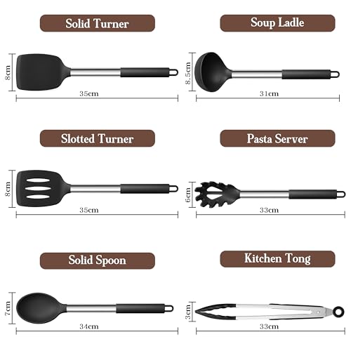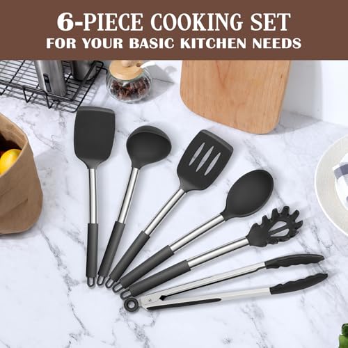 Onader Black Kitchen Utensils Set, 6 Pieces Silicone Cooking Utensils for Non-Stick Cookware, Heat Proof Kitchen Cooking Tools, Stainless Steel Handle & Dishwasher Safe