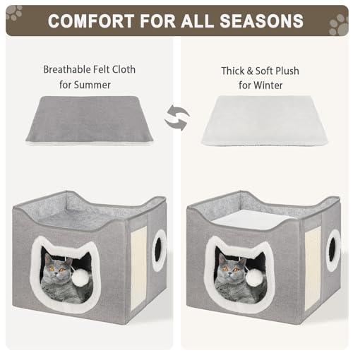 UNKJIN Cat House, Cat Beds for Indoor Cats, Foldable Cat Cave with Fluffy Ball and Scratching Pad, Cat House Indoor for Multi Small Pets, Grey