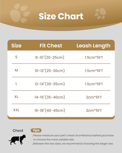 🐱 Size of Cat Harness with Leash: Fit Small Medium Large Cats. Our cat vest have 4 sizes, Our cat vests are small, if your pet is between two sizes, we recommend a larger size. S: Chest: 19-24cm (7.5″-9.5″), M: Chest: 24-29cm (9.5″-11.5″), L: Chest: 29-34cm (11.5″-13.5″), XL: Chest: 34-39cm (13.5″-15.5″). There may have some difference in the different breeds. The package will come with a harness and a leash.