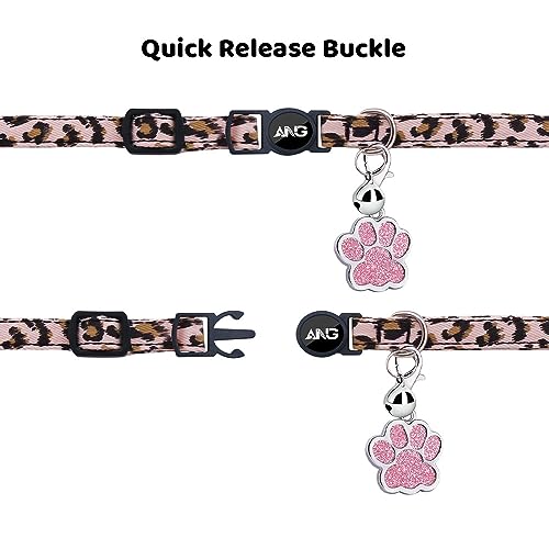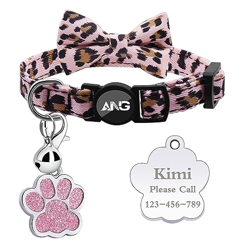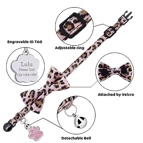 Personalised Breakaway Cat Collars – ID Tag, Bell, Bowtie – Safety Quick-Release, Customised for Female & Male Cats-Leopard Pattern-Pink