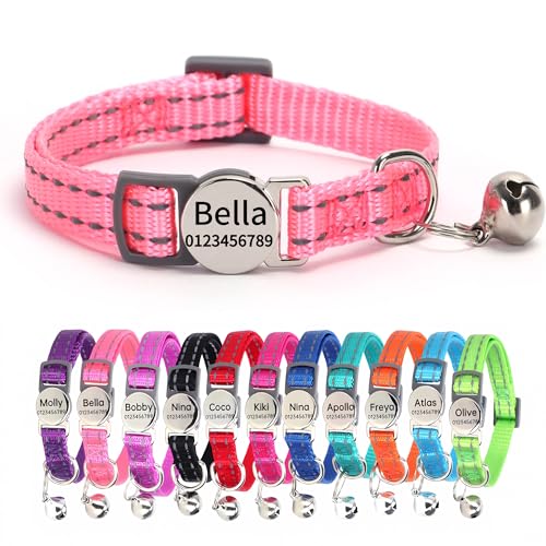 SEOUGEE Cat Collar Quick Release with Personalised Name Tag, Reflective Kitten Collars with Bells & Safety Release, 19-30 CM Adjustable, Pink