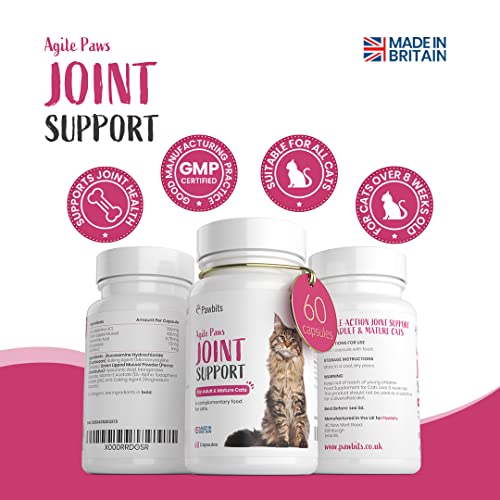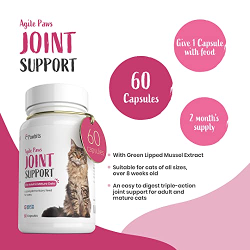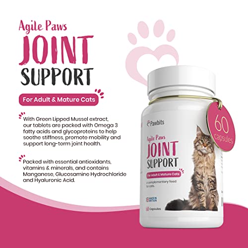 60 Pawbits Joint Support for Cats Tablets for Stiff & Mature Adult Cats Anti-Inflammatory Relief Supplements, Green Lipped Mussel, Glucosamine & Hyaluronic Acid Sprinkle Capsules (60)