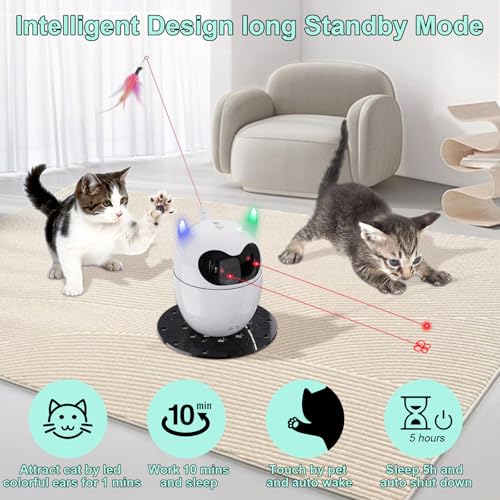 Adjustable Red Light Angle: According to the size of the cat, the laser Angle of the cat toy can be freely adjusted by the control key; The 2pcs base bracket prevents toys from tipping over, keeps it stable, and allows our cats to exercise happily. When it is started, the color led ear flashes for 1 minute when it is opened to attract the interest of pets
