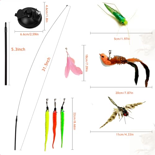 【Cat Toys Set】Package contains 1 suction cup, 1 cat wand, 1 Bird toy, 1 dragonfly toy, 1 grasshopper toy, 3 worm toys, 1 feather toy. All Cat Toys are universal, they are durable and will keep your cat interested.
