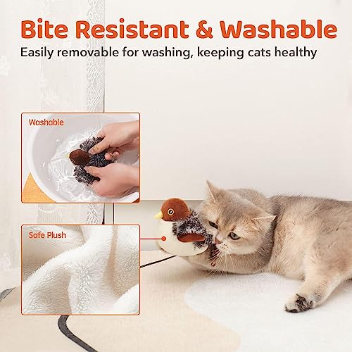 【Safe and Durable】The flappy bird cat toy is made of high-grade flannel and high-quality electronic components, which is not easy to fall off, making it an ideal cat toy for indoor cats. The chirping bird cat toy has 3 different movement frequencies and realistic bird sounds, giving your cat a more realistic hunting experience.