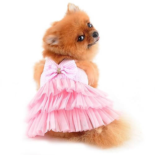 PAIDEFUL Small Dog Dress Striped Denim Organza Bow Beads Tutu Skirt Summer Soft Comfortable Breathable Puppy Clothes Sleeveless Button Kitten Apparel, Pink, S