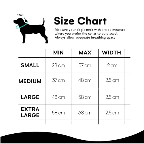 SIZING: Small 30-39 cm, Medium 38-49 cm, Large 48-59 cm, XL/XLarge 58-69 cm. Measure your dog’s neck with a tape measure at the preferred resting place for the collar. Always allow for adequate breathing room