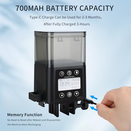 【USB Rechargeable】- The battery capacity is 700mAh which takes 3-4 hours to complete the charging. According to different settings of feeding, the automatic fish feeder can be used for 2-4 months when it is fully charged. No need to buy batteries repeatedly, which is energy saving and environmental protection.