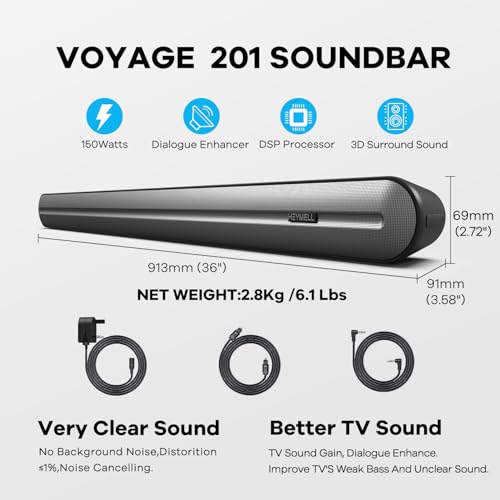 Heymell 150W Clear Voice Sound bar for TV, 2.1ch Bluetooth Soundbar for TV Built-in Subwoofer, Surround Sound Dialogue Enhancer, Soundbar HDMI ARC Optical Coaxial AUX